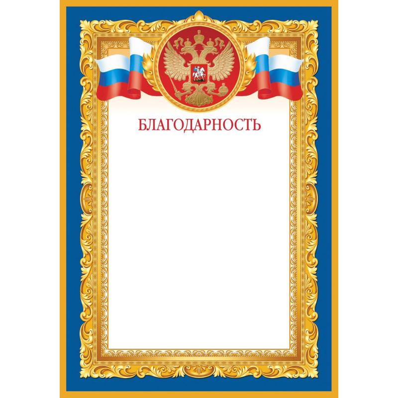 Благодарность А4 190 г/кв.м с тиснением фольгой (10 штук в упаковке, 1538-07)<br><br>Поздравительный бланк «Благодарность» для официального поздравления с государственной символикой.<br>Печать: −4+1. Бумага: картон мелованный целлюлозный с белым оборотом, плотность 190 г/кв.м. <br>Размер бланка — 210×300 мм.<br>В упаковке 10 шт.