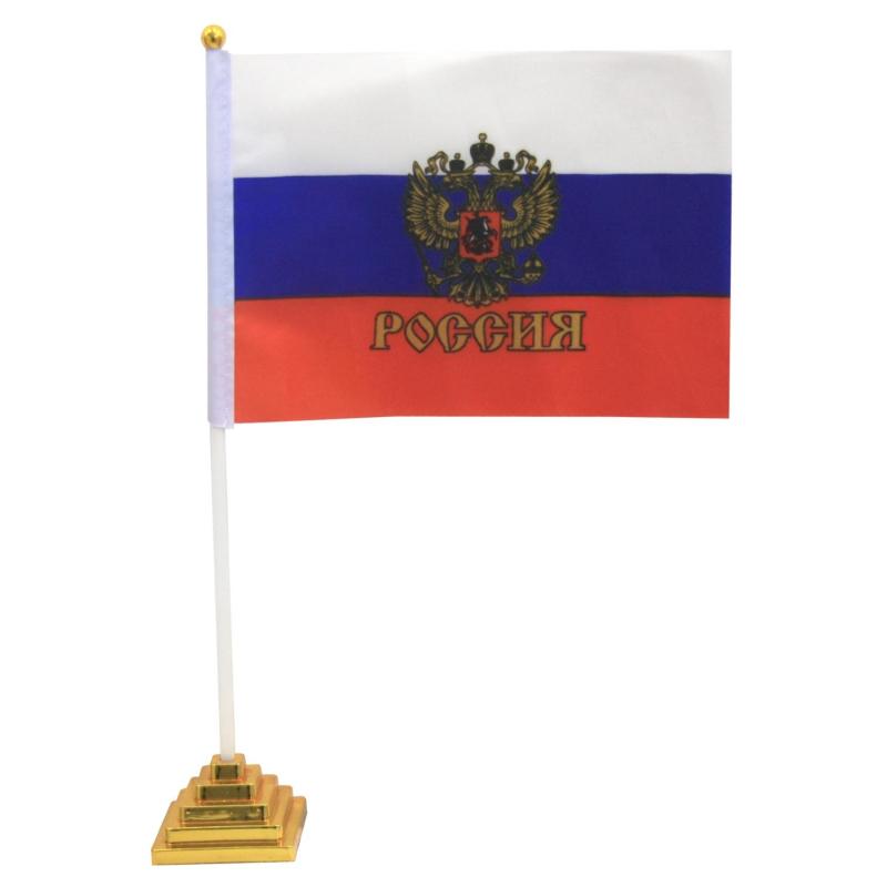 Флаг Российской Федерации с гербом 14×21 см с флагштоком 75 г/кв.м.<br><br>Флаг Российской Федерации с гербом 14×21 см с флагштоком используется как в помещении, так и на улице. Он может быть отличным элементом декора для офисов, кабинетов, конференц-залов или сувениром на праздничные события, такие как День Победы 9 Мая. Флаг оснащен флагштоком, что облегчает его использование и установку.<br><br>Изготовлен из полиэфира с плотностью ткани 75 г/кв.м, что обеспечивает долговечность и стойкость к внешним воздействиям. Метод шелкотрафаретной печати гарантирует яркость цветов и четкость изображения.<br><br>Цвет на изображении товара в интернет-магазине или в печатном каталоге может отличаться от оригинала из-за особенностей цветопередачи.
