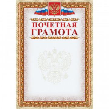 Грамота почетная А4 140 г/кв. м (40 штук в упаковке, КЖ-156уп). Бланк выполнен в классическом торжественном стиле. Он имеет разноцветную рамку с изящным орнаментом сдержанных тонов и светлый фон с узором. В верхней части расположены государственный герб и триколор, придающие документу официальность и значимость. Грамота предназначена для награждения за заслуги в учебе, спорте, трудовой деятельности, а также для выражения признательности и благодарности сотрудникам, коллегам и партнерам. Она отпечатана на мелованной бумаге плотностью 140 г/кв. м, подходит для печати на принтере. Размер бланка — А4. В упаковке 40 шт.