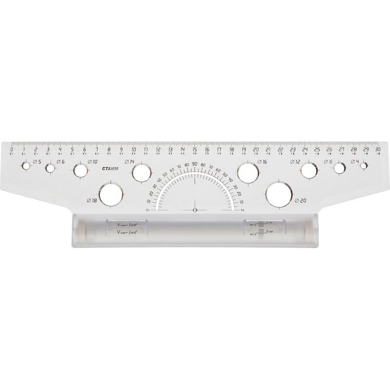 Линейка рейсшина Стамм ЛР25/ЛР-30478 30 см пластиковая прозрачная<br><br>Линейка является незаменимым помощником при чертёжных работах в образовательных учреждениях и офисах, а также дома.<br>Линейка Стамм 30 см. Выполнена из пластика. Деления наносятся с использованием специальных чернил для оптимальной стойкости.<br>У рейсшины имеется транспортир и трафареты-окружности нескольких диаметров.<br>Рейсшина позволяет с высокой точностью чертить параллельные, вертикальные и горизонтальные линии, оптимальна для чертёжно-конструкторских работ.<br>Легко читать: наглядные индикаторы.<br>Выполнена из бесцветного материала, полностью прозрачна.