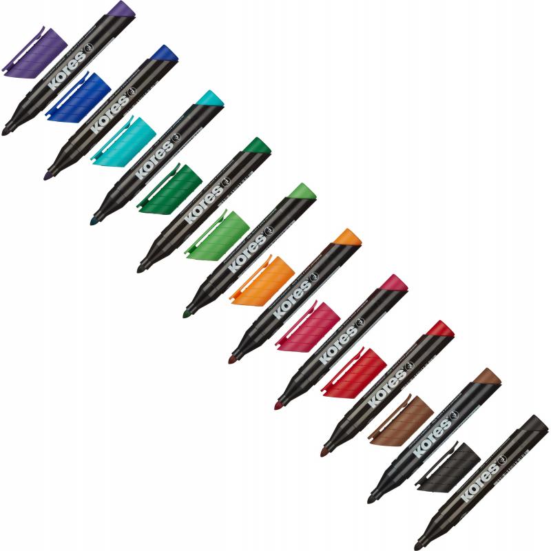 <p>Перманентный маркер Kores с круглым наконечником. Цвет чернил: оранжевый, красный, розовый, фиолетовый, синий, бирюзовый, коричневый, салатовый, зеленый, черный. Нестираемые чернила на спиртовой основе. Подходит для письма на различных поверхностях. Позволяет проводить линии толщиной 1.5–3 мм. Безопасен при использонии по назначению. Хранить в горизонтальном положении в сухом месте при температуре от 10 до <nobr>40 °C</nobr>. Изготовлено в Чехии. Размеры маркера: диаметр 17 мм, длина 141 мм.</p>
