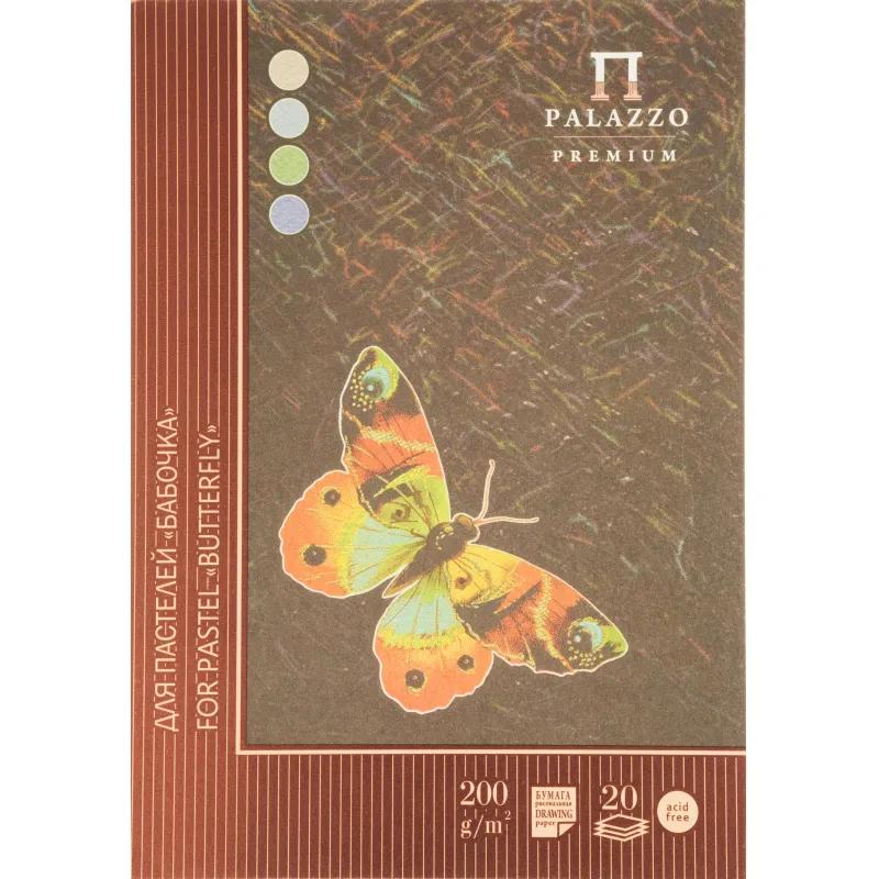 Альбом для пастели, угля, сангины Palazzo Бабочка А4 20 листов<br><br>Бумага для рисования, тонированная в массе, плотность 200 г/м2.<br>Подходит для работы с различными техниками рисования и художественными материалами, включая: сухую и масляную пастель, уголь, сангину, сепию, соус, чернила, рисование мелками и карандашами.<br>Каллиграфия — особый вид техники письма, где нужна специальная бумага, чтобы перо не цеплялось за текстуру бумаги.<br>Наша бумага поможет воплотить все идеи и сохранить следующий лист чистым. Даже если чернила будут очень жидкими, благодаря, толстой бумаге её не поведёт волнами.<br>Также советуем попробовать данную бумагу для китайской каллиграфии, где используется кисть из козы.<br>Отсутствие текстуры и ровная гладкая поверхность позволит сделать те самые красивые и нужные штрихи для получения идеального письма или рисунка.<br>Формат: А4.