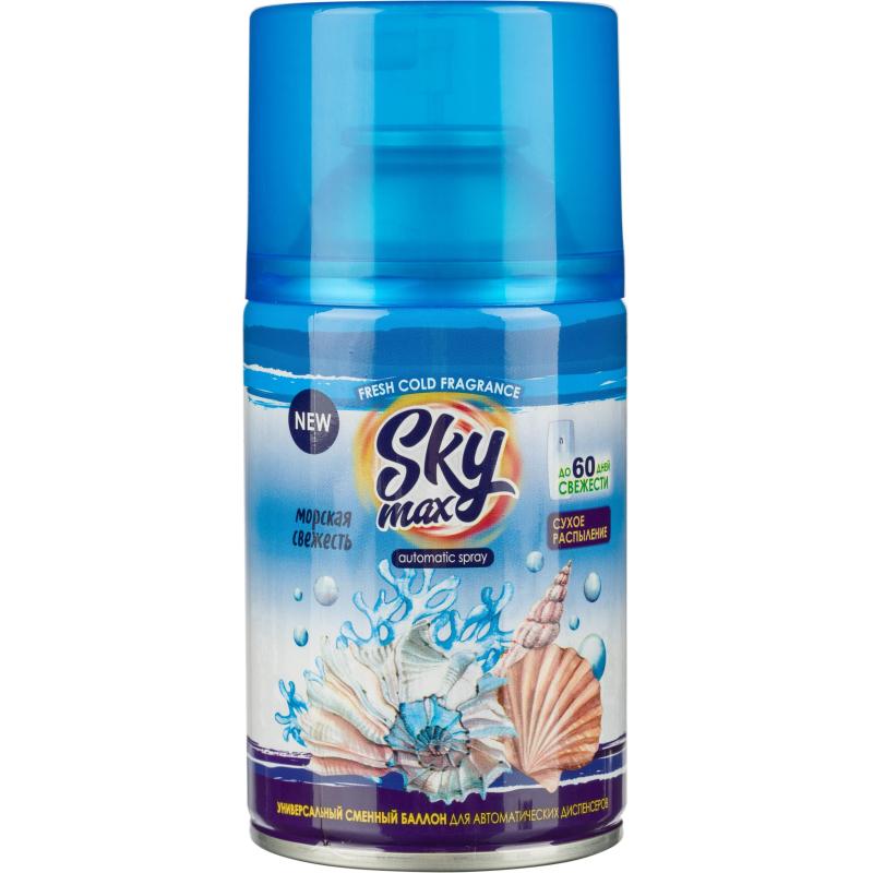 Баллон сменный для автоматического освежителя Sky Max Морская Свежесть 250 мл<br><br>Назначение: предназначен для использования в качестве сменного баллона в автоматических освежителях воздуха соответствующей конструкции. Баллон можно использовать, как отдельно от диспенсера, так и в качестве сменного блока.<br>Способ применения: перед тем, как вставить аэрозоль, проверьте, что диспенсер выключен. Не направляйте в лицо при включении или при установке интервала распыления.<br>1) Откройте диспенсер, повернув против часовой стрелки верхнюю часть устройства. Вставьте Баллон сменный в нижнюю часть диспенсера. Закройте диспенсер, совместив верхнюю и нижние части и повернув верхнюю часть по часовой стрелке.<br>2) Откройте верхнюю часть устройства, потянув крышку вверх.<br>3) Вставьте 2 батарейки согласно обозначениям (+) и (-).<br>4) Установите на регуляторе временной интервал распыления.<br>5) Не направляйте устройство в лицо. Распыление начнётся автоматически через 15 секунд.<br>6) Установите устройство в выбранное место на высоте не менее 2-х метров от пола.<br>Меры предосторожности: огнеопасно! Баллон под давлением. Не устанавливать вблизи источников тепла, огня или искр, электрического оборудования и под прямыми солнечными лучами — в любых местах, где работающая система может нагреваться свыше 50°С. Не распылять вблизи открытого огня и раскалённых предметов. Не курить! Не разбирать, не сжигать и не прокалывать баллон даже после использования. В случае попадания на кожу смыть тёплой водой, при появлении раздражения или проглатывании — обратиться к врачу. При попадании в глаза осторожно промыть большим количеством воды, при наличии линз удалить их и продолжить промывание. Использовать баллон только по прямому назначению.<br>Состав: смесь пропана, бутана и изобутана (>30%), растворитель (>30%), парфюмерная композиция (<5%), лимонен.<br>Условия хранения: хранить в недоступном для детей месте при температуре от −20°С до 40°С. После использования утилизировать как бытовой отход. Срок годности: 36 месяцев.
