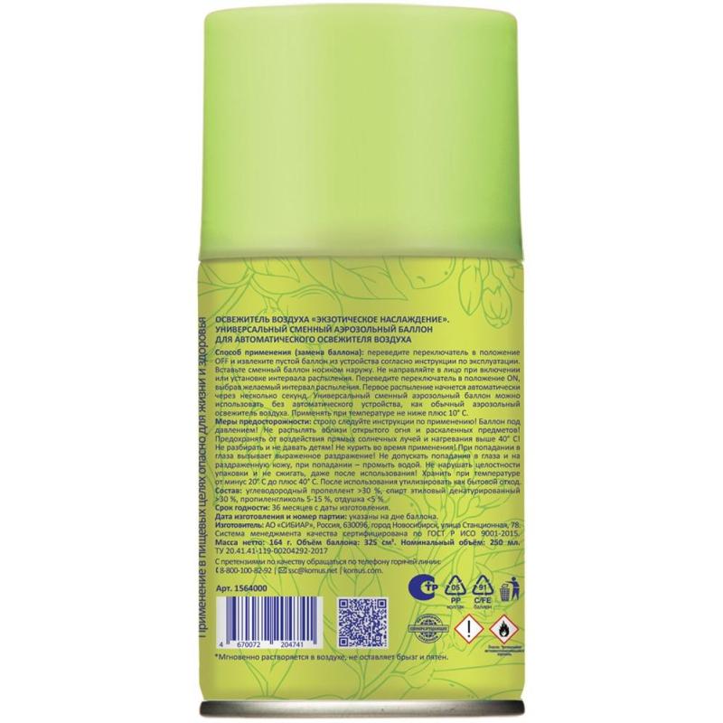 Баллон сменный для автоматического освежителя Luscan Экзотическое наслаждение 250 мл сухое распыление<br><br>Назначение/особенности: универсальный Баллон сменный Luscan подходит для автоматических систем дезодорирования, устраняет неприятные запахи и дарит лёгкий свежий аромат. Подходит для дома и любых общественных мест. Формула сухого распыления экономична в использовании и не оставляет следов на поверхности.<br>Способ применения: замена баллона — переведите переключатель в положение «off» и извлеките пустой баллон из устройства согласно инструкции по эксплуатации. Вставьте Баллон сменный носиком наружу. Не направляйте в лицо при включении или установке интервала распыления. Переведите переключатель в положение «on», выбрав желаемый интервал распыления. Первое распыление начнётся автоматически через несколько секунд. Универсальный сменный аэрозольный баллон можно использовать без автоматического устройства, как обычный аэрозольный освежитель воздуха. Применять при температуре не ниже плюс 10°C.<br>Меры предосторожности: строго следуйте инструкции по применению! Баллон под давлением! Не распылять вблизи открытого огня и раскалённых предметов! Предохранять от воздействия прямых солнечных лучей и нагревания выше 40°C! Не разбирать и не давать детям! Не курить во время применения! Не допускать попадания в глаза и на раздражённую кожу, при попадании — промыть водой. Не нарушать целостности упаковки и не сжигать, даже после использования! После использования утилизировать как бытовой отход.<br>Состав: углеводородный пропеллент > 30%, спирт этиловый денатурированный > 30%, пропиленгликоль 5–15%, отдушка &706; 5%.<br>Условия хранения: хранить при температуре от −20 до +40°С.<br>Срок годности: 36 месяцев с даты изготовления (дату изготовления см. на упаковке).