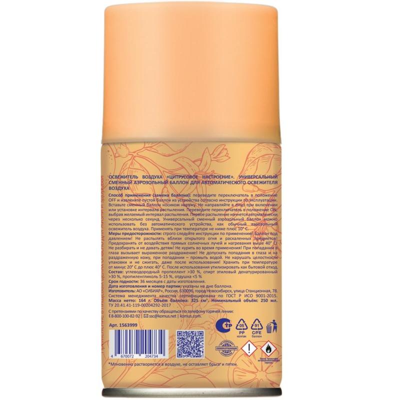 Баллон сменный для автоматического освежителя Luscan Цитрусовое настроение 250 мл<br><br>Назначение/особенности: универсальный Баллон сменный Luscan подходит для автоматических систем дезодорирования, устраняет неприятные запахи и дарит лёгкий цитрусовый аромат. Подходит для дома и любых общественных мест. Формула сухого распыления экономична в использовании и не оставляет следов на поверхности.<br>Способ применения: замена баллона — переведите переключатель в положение «off» и извлеките пустой баллон из устройства согласно инструкции по эксплуатации. Вставьте Баллон сменный носиком наружу. Не направляйте в лицо при включении или установке интервала распыления. Переведите переключатель в положение «on», выбрав желаемый интервал распыления. Первое распыление начнётся автоматически через несколько секунд. Универсальный сменный аэрозольный баллон можно использовать без автоматического устройства, как обычный аэрозольный освежитель воздуха. Применять при температуре не ниже плюс 10°C.<br>Меры предосторожности: строго следуйте инструкции по применению! Баллон под давлением! Не распылять вблизи открытого огня и раскалённых предметов! Предохранять от воздействия прямых солнечных лучей и нагревания выше 40°C! Не разбирать и не давать детям! Не курить во время применения! Не допускать попадания в глаза и на раздражённую кожу, при попадании — промыть водой. Не нарушать целостности упаковки и не сжигать, даже после использования! После использования утилизировать как бытовой отход.<br>Состав: углеводородный пропеллент > 30%, спирт этиловый денатурированный > 30%, пропиленгликоль 5–15%, отдушка &706; 5%.<br>Условия хранения: хранить при температуре от −20 до +40°С.<br>Срок годности: 36 месяцев с даты изготовления (дату изготовления см. на упаковке).