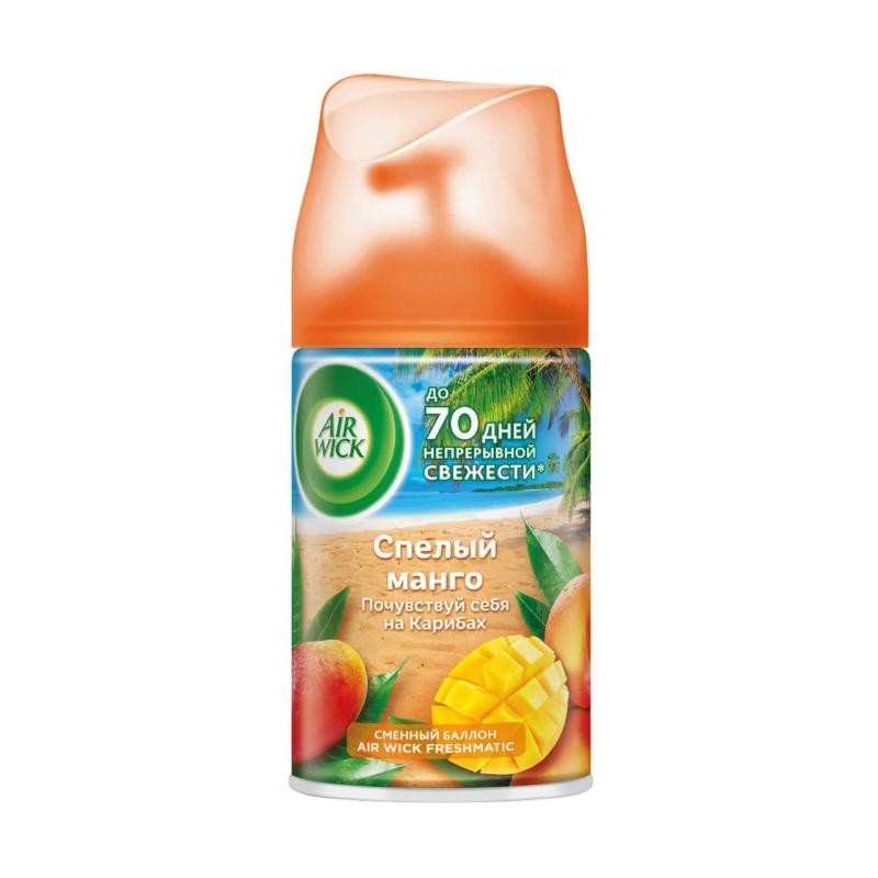 Баллон сменный для автоматического освежителя Air Wick Тропические фантазии Спелый манго 250 мл<br><br>Назначение/особенности: наслаждайтесь изысканным ароматом спелого манго в течение 70 дней вместе с аэрозольным освежителем Air Wick Freshmatic Тропические фантазии Спелый манго. Баллон сменный освежителя воздуха поможет поддерживать в доме приятный и свежий аромат. Средство прекрасно борется с любыми нежелательными запахами. Его можно устанавливать на кухне, в ванной комнате или туалете. Аэрозоль не оставляет разводов и других следов на занавесках, мебели и других предметах.<br>Способ применения: прочитать внимательно этикетку перед использованием и сохранить её на весь период использования продукта. Вставить баллон в выключенный автоматический распылитель. Всегда направлять струю аэрозоля от лица. Включить — распыление начнётся через 15 секунд.<br>Меры предосторожности: хранить в недоступном для детей и животных месте. Беречь от солнечных лучей, избегать нагревания выше 50°С. Беречь от источников воспламенения/нагревания/искр/открытого огня. Не курить. Не распылять вблизи открытого огня или других источников воспламенения. Не нарушать целостности упаковки и не сжигать, даже после использования. Не разбирать и не давать детям. При попадании в глаза: осторожно промыть глаза водой в течение нескольких минут. Снять контактные линзы, если Вы ими пользуетесь и, если это легко сделать. Продолжить промывание глаз. При необходимости обратиться за медицинской помощью, по возможности показать упаковку/маркировку продукта. Использовать только по прямому назначению. Не вдыхать аэрозоль. Использовать с осторожностью при повышенной чувствительности к парфюмерным отдушкам. Освежители воздуха не являются заменой надлежащих мер гигиены. Использовать только в хорошо проветриваемых помещениях. Более полная информация по безопасному обращению химической продукции находится в паспорте безопасности.<br>Состав: 30% и более: пропеллент (смесь: Пропан, Бутан), этиловый денатурированный спирт; менее 5%: ароматизирующие добавки, в том числе альфа-изометилионон, цитраль, цитронеллол, гексилциннамаль, лимонен. Содержит тетраметилацетилоктагидронафталины.<br>Условия хранения: храните в недоступном для детей и животных месте.<br>Срок годности: 24 месяца с даты изготовления (дату изготовления см. на упаковке).