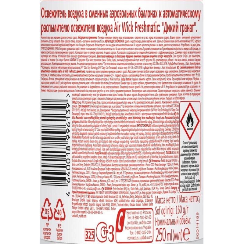 Баллон сменный для автоматического освежителя Air Wick Дикий гранат 250 мл<br><br>Назначение/особенности: наслаждайтесь изысканным ароматом дикого граната в течение 70 дней вместе с аэрозольным освежителем Air Wick Freshmatic Дикий гранат. Баллон сменный освежителя воздуха поможет поддерживать в доме приятный и свежий аромат. Средство прекрасно борется с любыми нежелательными запахами. Его можно устанавливать на кухне, в ванной комнате или туалете. Аэрозоль не оставляет разводов и других следов на занавесках, мебели и других предметах.<br>Способ применения: прочитать внимательно этикетку перед использованием и сохранить её на весь период использования продукта. Вставить баллон в выключенный автоматический распылитель. Всегда направлять струю аэрозоля от лица. Включить — распыление начнётся через 15 секунд.<br>Меры предосторожности: хранить в недоступном для детей и животных месте. Беречь от солнечных лучей, избегать нагревания выше 50°С. Беречь от источников воспламенения/нагревания/искр/открытого огня. Не курить. Не распылять вблизи открытого огня или других источников воспламенения. Не нарушать целостности упаковки и не сжигать, даже после использования. Не разбирать и не давать детям. При попадании в глаза: осторожно промыть глаза водой в течение нескольких минут. Снять контактные линзы, если Вы ими пользуетесь и, если это легко сделать. Продолжить промывание глаз. При необходимости обратиться за медицинской помощью, по возможности показать упаковку/маркировку продукта. Использовать только по прямому назначению. Не вдыхать аэрозоль. Использовать с осторожностью при повышенной чувствительности к парфюмерным отдушкам. Освежители воздуха не являются заменой надлежащих мер гигиены. Использовать только в хорошо проветриваемых помещениях. Более полная информация по безопасному обращению химической продукции находится в паспорте безопасности.<br>Состав: 30% и более: пропеллент (смесь: Пропан, Бутан), этиловый денатурированный спирт; менее 5%: ароматизирующие добавки, в том числе альфа-изометилионон, цитраль, цитронеллол, гексилциннамаль, лимонен. Содержит тетраметилацетилоктагидронафталины.<br>Условия хранения: храните в недоступном для детей и животных месте.<br>Срок годности: 24 месяца с даты изготовления (дату изготовления см. на упаковке).