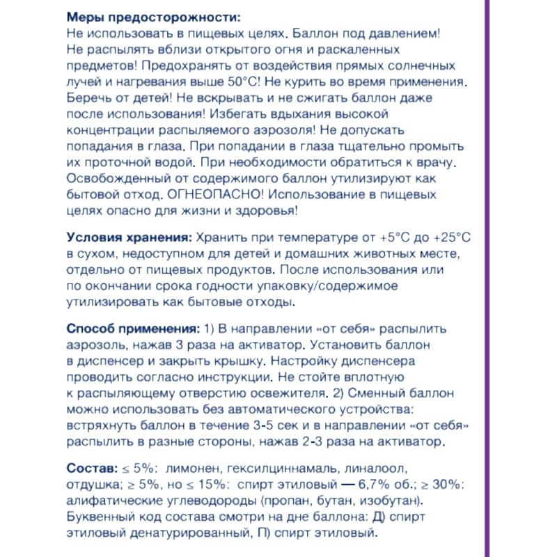 Баллон сменный для автоматического освежителя Торк Стандарт A1 100 мл (611601)<br><br>Аэрозольный освежитель воздуха Tорк позволяет эффективно контролировать запах в туалетной комнате при минимальных усилиях. Содержит концентрированные ароматические вещества, которые устраняют в помещении неприятные запахи, наполняют его лёгкими, нежными ароматами, и поддерживает свежесть на протяжении долгого времени. Предназначен для использования в диспенсерах Tork для аэрозольного освежителя воздуха. Благодаря программируемым режимам распыления возможно использование в туалетных комнатах разной площади. Не содержит вещества, разрушающие озоновый слой, безопасен для человека и природы.<br>Способ применения:<br>1) В направлении «от себя» распылить аэрозоль, нажав 3 раза на активатор. Установить баллон в диспенсер и закрыть крышку. Настройку диспенсера проводить согласно инструкции. Не стойте вплотную к распыляющему отверстию освежителя.<br>2) Сменный баллон можно использовать без автоматического устройства: встряхнуть баллон в течение 3-5 сек и в направлении «от себя» распылить в разные стороны, нажав 2-3 раза на активатор.<br>Меры предосторожности: не использовать в пищевых целях. Баллон под давлением. Не распылять вблизи открытого огня и раскалённых предметов. Предохранять от воздействия прямых солнечных лучей и нагревания выше 50°С. Не курить во время применения. Беречь от детей. Не вскрывать и не сжигать баллон даже после использования. Избегать вдыхания высокой концентрации распыляемого аэрозоля. Не допускать попадания в глаза. При попадании в глаза тщательно промыть их проточной водой. При необходимости обратиться к врачу. Освобождённый от содержимого баллон утилизируют как бытовой отход. Огнеопасно. Использование в пищевых целях опасно для жизни и здоровья.<br>Условия хранения: хранить при температуре от +5°С до +25°С в сухом, недоступном для детей и домашних животных месте, отдельно от пищевых продуктов. После использования или по окончании срока годности упаковку/содержимое утилизировать как бытовые отходы.<br>Состав: 5%: лимонен, гексилциннамаль, линалоол, отдушка; 5%, но 15%: спирт этиловый — 6.7% об.; 30%: алифатические углеводороды (пропан, бутан, изобутан).