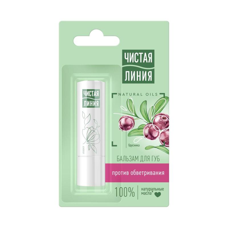 Бальзам для губ Чистая Линия Против обветривания Брусника 4 г<br><br>Специально для сухих и подверженных обветриванию губ эксперты бренда Чистая Линия разработали бальзам против обветривания.<br><br>Уникальная формула бальзама против обветривания Брусника содержит 100% натуральные экстракты и масла, нежно обволакивает и эффективно защищает от неблагоприятного воздействия окружающей среды.<br><br>Масло кокоса интенсивно смягчает, увлажняет. Масло какао создаёт на поверхности тонкую невидимую вуаль и защищает от потери влаги. Касторовое масло и масло ши смягчают и питают, они эффективны для потрескавшейся и обезвоженной кожи. Масло облепихи, богатое витаминами, обладает тонизирующим действием и активизирует процессы восстановления. Витамин Е помогает предотвратить преждевременное старение кожи. Листья брусники богаты природными антиоксидантами, которые помогают коже противостоять воздействию свободных радикалов.<br><br>Благодаря своей продуманной формуле, бальзам:<br>• Защищает, создаёт невидимый барьер для защиты кожи губ от обветривания и потери влаги;<br>• Питает и восстанавливает кожу губ;<br>• Смягчает, придаёт коже губ гладкость и нежность.<br><br>Продукт не содержит в составе парабенов и красителей. Бальзам Чистая Линия может быть использован в качестве самостоятельного средства и как основа под помаду.<br><br>Мы берём лучшее от природы, чтобы позаботиться о вашей красоте, и верим, что о природе нужно заботиться так же, как о себе. Вы с нами?<br><br>Состав: Ricinus Communis (Castor) Seed Oilx, Prunus Amygdalus Dulcis (Sweet Almond) Oilx, Butyrospermum Parkii (Shea) Butterx, Cera Microcristallina, Paraffinum Liquidum, Cyclopentasiloxane, Ethylhexyl Stearate, Caprylic/Capric Triglyceride, C15-19 Alkane, Paraffin, Hydrogenated Castor Oil, Isopropyl Myristate, Theobroma Cacao (Cocoa) Seed Butterx, Cocos Nucifera (Coconut) Oilx, Isodecyl Neopentanoate, Stearyl Heptanoate, Helianthus Annuus (Sunflower) Seed Cerax, Vaccinium Vitis-Idaea Leaf Extractx, Hippophae Rhamnoides Fruit Juicex, Hippophae Rhamnoides Oilx, Tocopherol, Tocopheryl Acetate, Aqua, Ascorbyl Palmitate, Glycine Soja (Soybean) Oilx, Helianthus Annuus (Sunflower) Seed Oilx, Parfum, Phenoxyethanol, Stearyl Caprylate, Hexyl Cinnamal, Limonene, Linalool.<br>В составе отмечены 100% натуральные экстракты и масла.