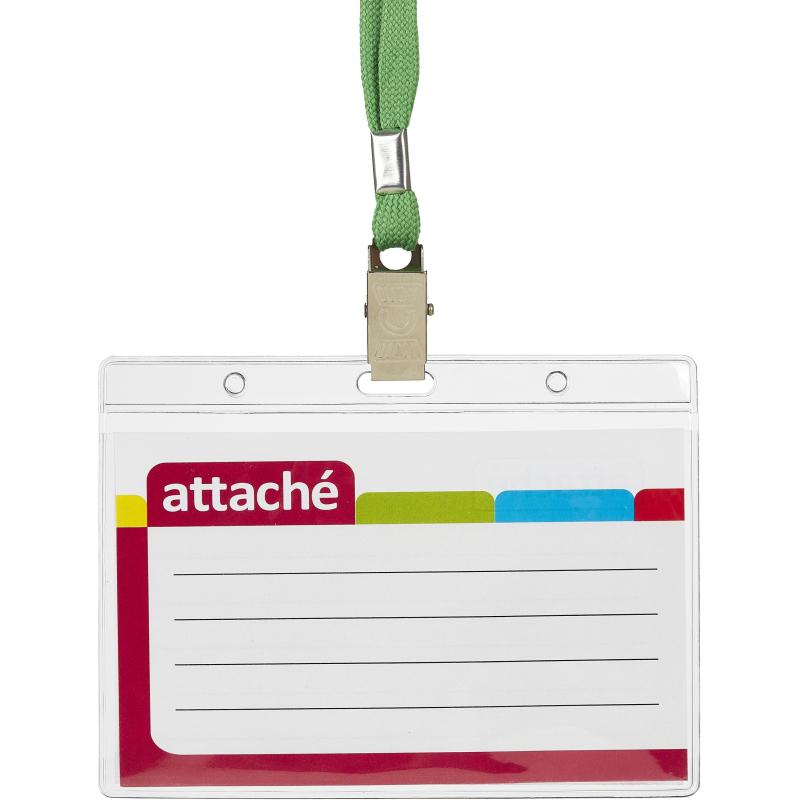 Бейдж Attache горизонтальный. Размер бейджа — 87×120 мм, размер вкладыша — 70×113 мм. Поставляется с вкладышем. Крепление изделия осуществляется при помощи металлического зажима на тесьме. Цвет тесьмы — зеленый. Подходит для именных карточек и пропусков. Поставляется в упаковке в количестве 10 штук.