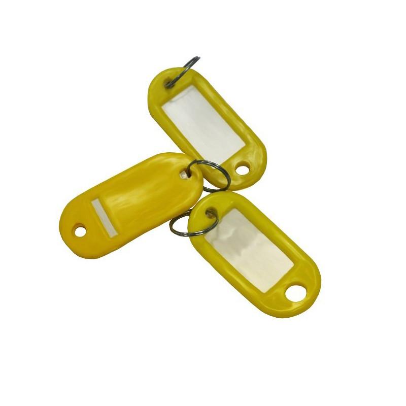 <p>Бирки для ключей изготовлены из пластика жёлтого цвета. Поставляются комплектом по 10 бирок в упаковке. Каждая бирка для ключей снабжена металлическим кольцом. Внутри бирки есть белый бумажный вкладыш, защищённый слоем пластика от повреждения и намокания. На вкладыш можно нанести надпись.</p>