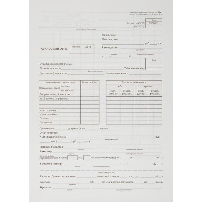 Бухгалтерские бланки — авансовый отчет, унифицированная форма АО-1. Применяются для учета денежных средств, выданных подотчетным лицам на административно-хозяйственные нужды. Бланки отпечатаны на газетной бумаге формата А4. В комплекте 5 книжек по 100 склееных листов. Упакованы в термоусадочную пленку.<br><br>Отсчет и запаковка бланков осуществляются на автоматическом оборудовании. В связи с этим, согласно имеющимся допускам оборудования, погрешность в количестве бланков в упаковке может составлять +3%.<br><br>В рамках ребрендинга производится перевод данного артикула из ТМ Attache Economy в ТМ Attache с сохранением всех потребительских свойств товара. Во время переходного периода допускается поставка данной продукции в двух вариантах дизайна упаковки.