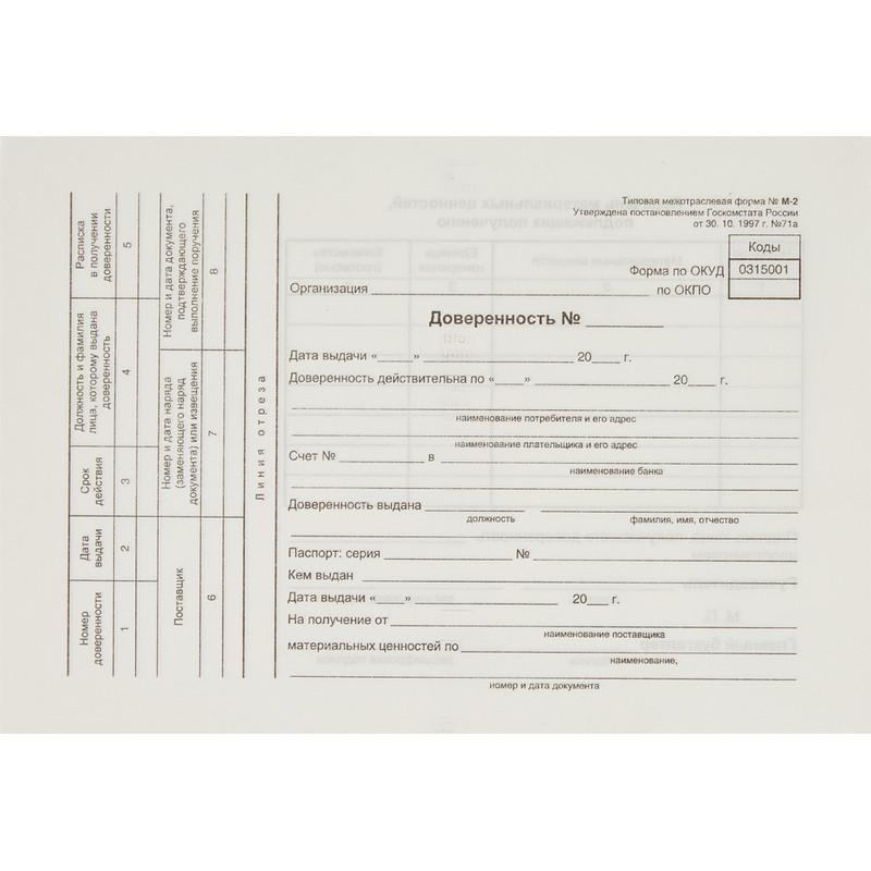Типовая межотраслевая форма № М-2<br>Удостоверяет право сотрудника организации выступать в качестве доверенного лица при получении материальных ценностей (по наряду, счету, договору, заказу, соглашению и т.п.)<br>Тип: бланк<br>Производитель: Attache<br>Формат: А5<br>Бумага: офсет<br>Упаковка: 100 листов в термоусадочной пленке, склейка.<br><br>Отсчет и запаковка бланков осуществляются на автоматическом оборудовании. В связи с этим, согласно имеющимся допускам оборудования, погрешность в количестве бланков в упаковке может составлять +/-3%.
