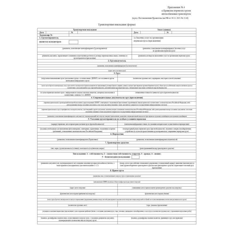 Бухгалтерские бланки Attache — транспортная накладная. Действуют наряду с товарно-транспортной накладной формы 1-Т, применяются для учета движения товарно-материальных ценностей при перевозке автомобильным транспортом. Бланки отпечатаны на офсетной бумаге формата А4. Форма соответствует Постановлению Правительства РФ от 31.12.2021 № 2116, которая действительна с 01 января 2021 г. В комплекте 100 штук, склеенных в виде книжки. Упакованы в термоусадочную пленку.<br><br>Отсчет и запаковка бланков осуществляются на автоматическом оборудовании. В связи с этим, согласно имеющимся допускам оборудования, погрешность в количестве бланков в упаковке может составлять +3%.