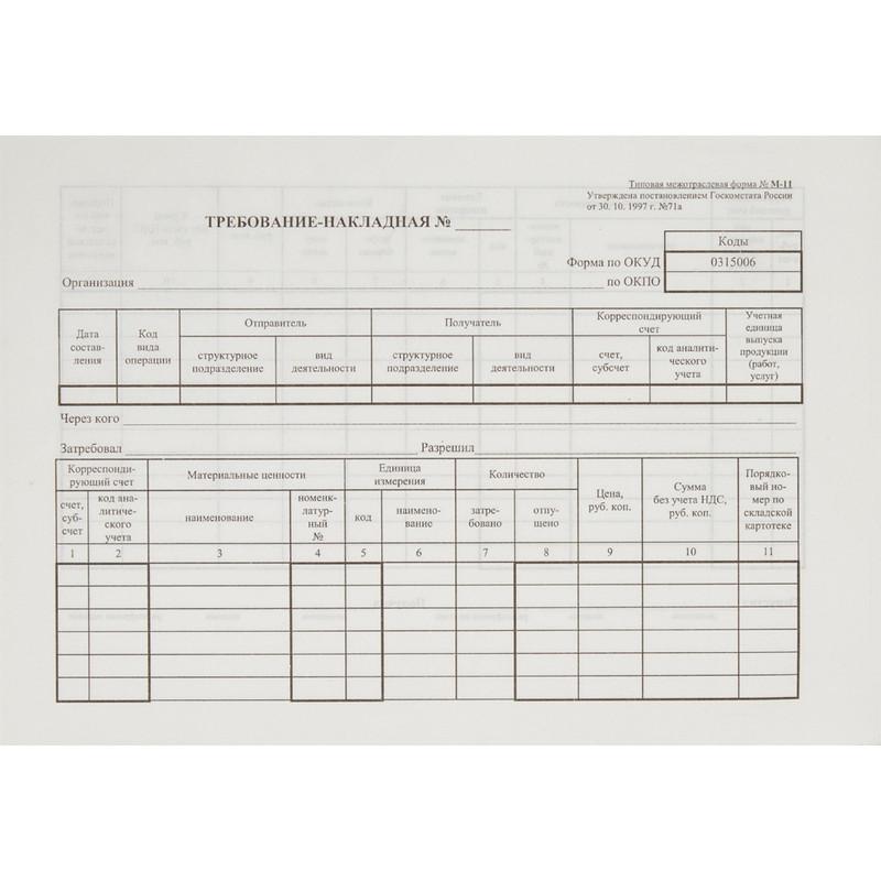 Типовая межотраслевая форма № М-11<br>Применяется для учета движения материальных ценностей внутри организации между структурными подразделениями или материально ответственными лицами.<br>Этими же накладными оформляются операции по сдаче на склад или в кладовую остатков из производства неизрасходованных материалов, если они ранее были получены по требованию, а также сдача отходов и брака.<br>Тип: бланк<br>Производитель: Attache<br>Формат: А5 (148×210мм)<br>Бумага: офсет<br>Упаковка: 100 листов в термоусадочной пленке, склейка.<br><br>Отсчет и запаковка бланков осуществляются на автоматическом оборудовании. В связи с этим, согласно имеющимся допускам оборудования, погрешность в количестве бланков в упаковке может составлять +/-3%.