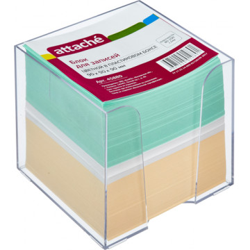 Блок для записей в боксе Attache предназначен для работы в офисе или дома. Будет полезен в использовании для рабочих процессов и повседневных задач, а также при проведении совещаний, обучений, мозговых штурмов. Идеально подходит для работников офиса .<br>Блок высотой 9 см сложен из квадратных листов размером 9×9 см и вложен в прозрачный пластиковый бокс. Листы не склеены между собой. Листы изготовлены из высококачественной офсетной бумаги плотностью 80-100 г/кв.м. В боксе представлены листы трех цветов: белого, зеленого, оранжевого. Блок для записей подходит для письма любыми типами ручек и карандашей. Благодаря высокой плотности листы не продавливаются при нажатии. Поставляется в термоусадочной пленке, защищающей блок при транспортировке.