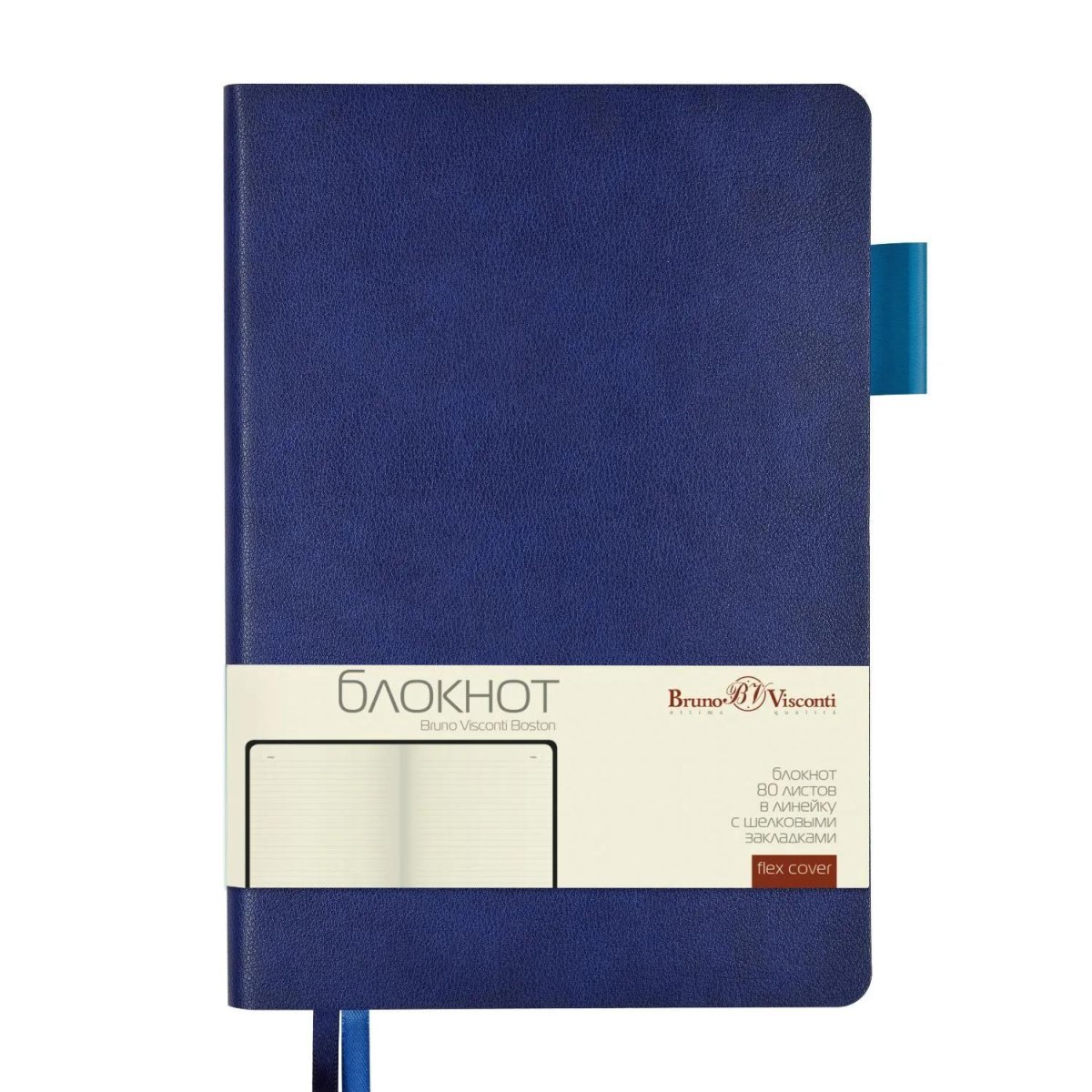 Блокнот Bruno Visconti Boston формата A5 предназначен для ведения рабочих и личных записей. Размер блока составляет 145×213 мм, размер листа — 14×21 см. Внутренний блок включает 80 листов бежевой офсетной бумаги, разлинованной в линейку без полей. Бумага имеет плотность 70 г/кв. м, что обеспечивает комфорт при письме. Линовка серого цвета, а цвет обреза — голубой.<br><br>Обложка выполнена из искусственной кожи синего цвета с покрытием Soft Touch, что придаёт блоку презентабельный внешний вид. Обложка имеет гибкую конструкцию с углами закруглённой формы. Блокнот оснащён двумя ляссе в цвет обложки и среза, а также петлёй для ручки, что делает его практичным в использовании. Изделие произведено в Китае и поставляется по одной штуке.