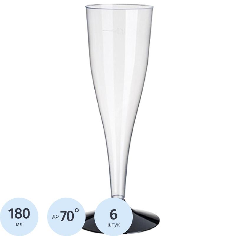 Бокал одноразовый для шампанского пластиковый 180 мл бесцветный 6 штук в упаковке Комус Стандарт.<br>Бокал одноразовый рекомендуется для использования на вечеринках, корпоративных мероприятиях, свадебных прогулках и прочих торжествах.<br>Бокалы емкостью 180 мл изготавливаются из прозрачного полистирола, основание черного цвета. Имеют малый вес, не разбиваются и удобны при транспортировке. Подходят для холодных напитков. Максимальная температура воздействия, при которой изделие не деформируется — 70°С.<br>Бокалы комплектуются по 6 штук в упаковке.<br>Верхний диаметр: 60 мм.<br>Нижний диаметр: 65 мм.<br>Высота: 170 мм (150 мм — бокал, 20 мм — ножка).<br><br>Товар произведен под контролем ’Комус’. Мы специально позаботились о Партнерах, которые превыше всего ценят качество и комфорт и разработали линейку Одноразовой посуды самых востребованных размеров для обеспечения быстрого питания в офисе, образовательных и производственных учреждениях, сферы гостеприимства и общественного питания и многих других. Производство расположено в России, что гарантирует постоянный контроль качества и оптимальные цены.