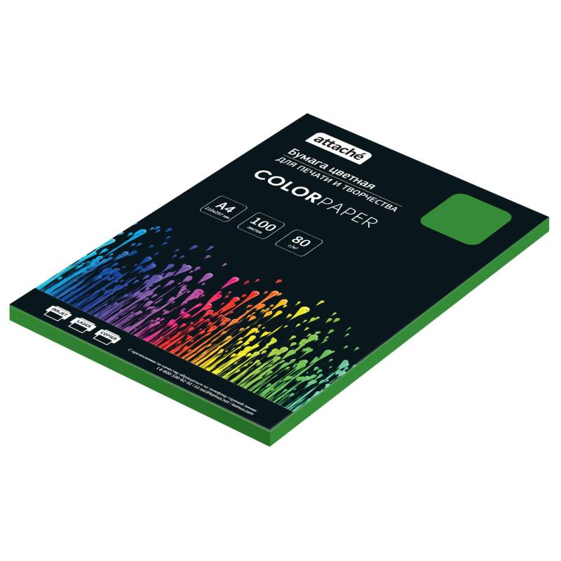 Бумага цветная Attache интенсивного зелёного цвета предназначена для печати на всех видах принтеров. Одна пачка содержит 100 листов формата А4, плотность которых составляет 80 г/кв.м. Страна производства: Китай.<br><br>Цветопередача монитора может искажать реальный цвет продукта.