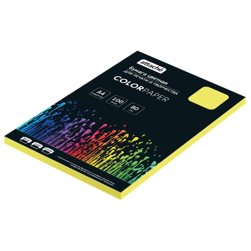 Бумага цветная Attache интенсивного жёлтого цвета предназначена для печати на всех видах принтеров. Одна пачка содержит 100 листов формата А4, плотность которых составляет 80 г/кв.м. Страна производства: Китай.<br><br>Цветопередача монитора может искажать реальный цвет продукта.