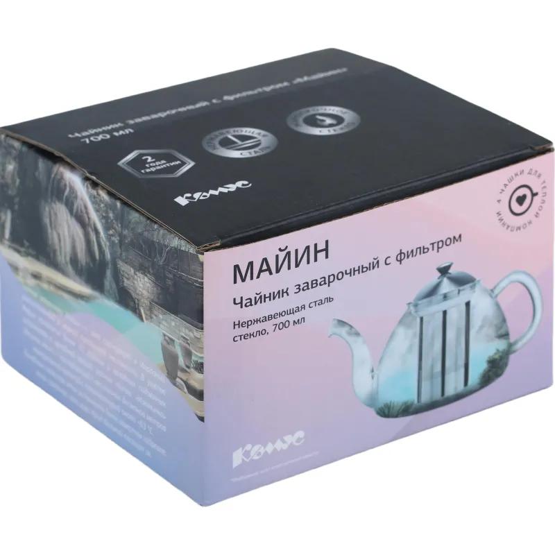 Чайник заварочный с фильтром выполнен из термостойкого боросиликатного стекла. Материал жароустойчив, устойчив к царапинам, сколам, не мутнеет и не впитывает запахи. Съёмный фильтр из нержавеющей стали 18/10 удобен в уходе. <br>Особенности модели: <br>— идеальная обработка краёв и качественная полировка; <br>— форма носика предотвращает подтекание; <br>— возможность мытья в посудомоечной машине. <br>При уходе не используйте агрессивные моющие средства или абразивы. <br>Избегайте резких перепадов температур: не наливайте кипяток в холодный стеклянный чайник и не охлаждайте горячий холодной водой. Резкие перепады температур могут привести к повреждению изделия. Нельзя ставить горячий чайник на холодные поверхности и доливать холодную воду сразу после кипячения. Перед заливкой кипятка прогрейте чайник теплой водой.
