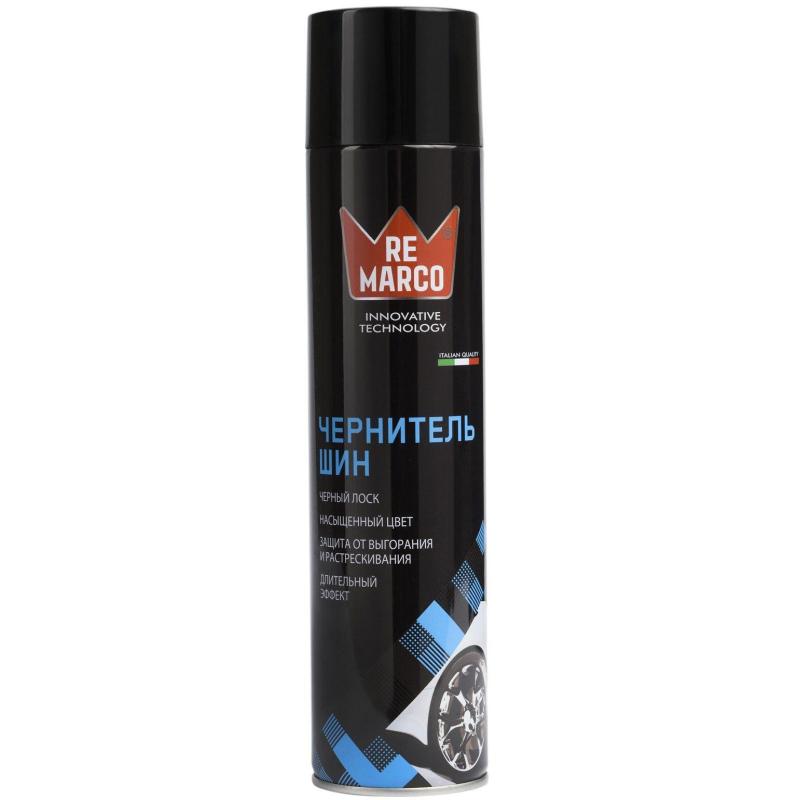 Чернитель шин Re Marco аэрозоль 600 мл<br><br>Современная пенная формула позволяет быстро очистить боковины покрышек и другие резиновые детали автомобиля, придавая им блеск и глубокий черный цвет. Благодаря пенной составляющей состав глубоко проникает в микротрещины, выталкивая грязь на поверхность. Образует непроницаемый барьер для УФ лучей, предохраняя резину от выгорания и растрескивания. Для поддержания блеска и цвета рекомендуется применять регулярно. Безопасен для любого типа ЛКП. Быстро высыхает, позволяя начать движение через несколько минут после использования. <br><br>Внешний вид и/или характеристики товара могут быть изменены производителем в соответствии с производственным процессом.