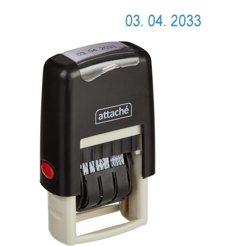 Пластиковый корпус с автоматическим окрашиванием печати. Установка даты с помощью колесиков. Месяц обозначается цифрами. Оттиск однострочный. Дата рассчитана минимум на 10, включая текущий год. Высота шрифта — 3 мм. Ширина одного знака — 1,5 мм. Размер оттиска — 3×20 мм. В комплекте: датер, синяя сменная подушка.