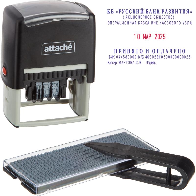 Датер автоматический самонаборный Attache предназначен для самостоятельного создания и изменения текста оттиска. Материал корпуса: пластик. Максимальное количество строк: 4. Легкая и чистая замена штемпельной подушки. Размер шрифта: 4 мм. Размер оттиска: 60×40 мм. Свободное поле: нет.