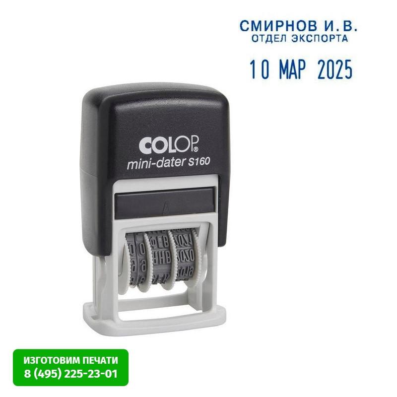<b>Для заказа печати или штампа с клише Вашего дизайна отправьте запрос на электронную почту reklama@komus.net или позвоните по телефону <nobr>(495)685-95-10</nobr>.</b><br><br>Компактный пластиковый корпус с автоматическим окрашиванием текста. Свободное поле под изготовление клише сверху, дата — снизу, устанавливается с помощью колесиков, рассчитана на 12 лет, включая текущий год. В комплекте: датер со свободным полем, синяя сменная подушка E/10 (арт. 5482).<br><br>Рекомендуемое/оптимальное количество строк текста (не считая дату) — 2 шт.<br><br>Внимание! Все сменные штемпельные подушки, которыми комплектуется продукция Colop, заправлены краской Noris (Германия) на водной основе с добавлением глицерина и предназначены для проставления оттисков на бумагу и пористые поверхности. При необходимости проставления оттисков спиртсодержащей краской при помощи автоматической оснастки, стандартную подушку, идущую в комплекте, необходимо заменить на специальную совместимую со спиртосодержащими красками, во избежание затвердевания подушечного материала. Заказывается отдельно.<br>