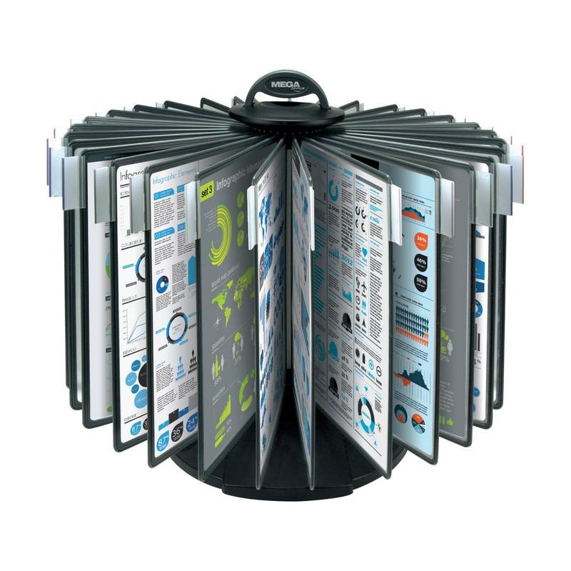 Демосистема настольная ProMega office вращающаяся с 30 панелями формата A4 серого цвета<br> <br> Демонстрационная система предназначена для размещения документов формата А4. Она оснащена 30 серыми панелями с цветными закладками-табуляторами, которые позволяют удобно сортировать информацию и быстро находить нужные материалы. В сумме в системе можно разместить до 60 документов.<br> <br> Панели выполнены из полипропилена, пригодного для повторной переработки. Прочные прозрачные карманы защищают документы от повреждений и обеспечивают их аккуратную подачу.<br> <br> Система оснащена круговым держателем, вращающимся на 360 градусов. Такая конструкция удобна для коллективного использования и даёт возможность нескольким людям одновременно работать с документами. Устойчивое основание предотвращает опрокидывание во время эксплуатации.<br> <br> В комплект входят основание, панели, табуляторы и отвёртка для сборки, которая позволяет установить систему без поиска дополнительных инструментов.