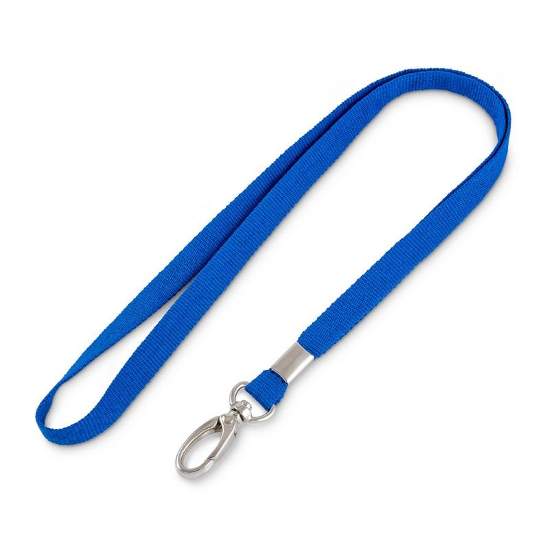 Лента для бейджа синего цвета с карабином-клешня. Лента изготовлена из репсового материала. Длина — 90 см, ширина — 10 мм. Используется для фиксации бейджа или пропуска.