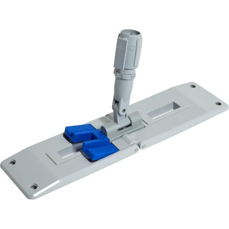 Держатель МОПа Росмоп предназначен для швабр-флаундеров с рабочей частью 40×10 см. Он изготовлен из ударопрочного и износостойкого пластика и весит 260 г. Конструкция позволяет использовать два типа креплений: карман и языки с силиконовыми кнопками.<br><br>Скошенные края упрощают вдевание в карманы насадки, а пружины в основании шарнира предотвращают складывание держателя пополам. Широкие языки препятствуют подворачиванию насадки под основание при движении, что облегчает ручную мойку полов. Модель складная, оснащена педалью и поддерживает поворот на 90°.