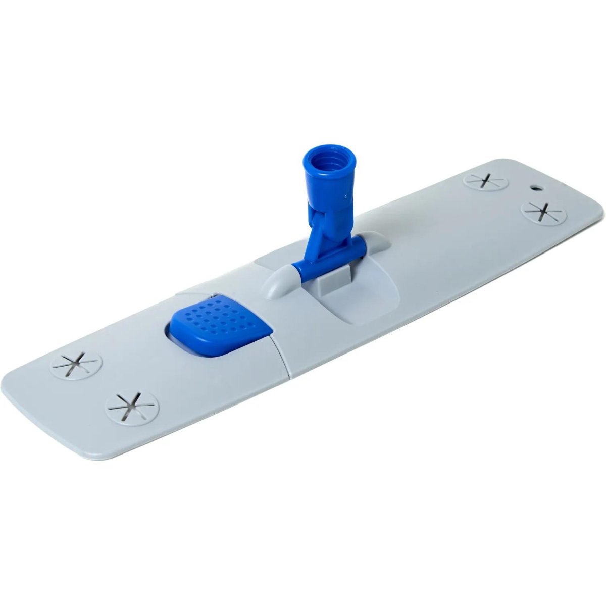 Держатель МОПа Росмоп 40×9.5 см пластик серый/синий<br><br>Держатель МОПа предназначен для сухой и влажной уборки полов и стен. Лёгкая конструкция весом 130 г снижает нагрузку при работе и делает инструмент удобным для обеспыливания и мойки вертикальных поверхностей. Рабочая часть размером 40×9.5 см обеспечивает эффективную обработку площади за один проход.<br>Крепление насадки осуществляется в зажимах или карманах, что позволяет быстро устанавливать и снимать салфетку. Конструкция складная, с поворотом на 90°, что облегчает доступ к труднодоступным местам. Дополнительно предусмотрена педаль для удобного управления. Изделие выполнено в сером и синем цветах, подходит для швабр-флаундеров с комбинированным креплением.