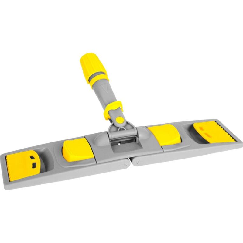 Держатель МОПа Luscan Professional — складной универсальный флаундер для влажной уборки, изготовленный из прочного полипропилена. Материал устойчив к механическим нагрузкам и агрессивным моющим средствам, что делает изделие надёжным и долговечным.<br><br>Держатель оснащён двумя педалями для удобного складывания и шарнирным соединением, которое обеспечивает плотный контакт МОПа с поверхностью и лёгкое управление во время работы. Такая конструкция позволяет эффективно убирать не только открытые площади, но и труднодоступные зоны: под мебелью, витринами и стеллажами.<br><br>Совместим с насадками, имеющими крепления «карман» и «ухо». Рукоятка фиксируется универсально — при помощи кольцевого Э-зажима или резьбового соединения (диаметр резьбы 23 мм).<br><br>Размер рабочей части — 50×11 см, вес — 425 г. Цвет — серый/жёлтый. Наличие цветовой кодировки соответствует стандарту ХАССП и исключает риск перекрёстного загрязнения. Страна производства — Турция. Материал — пластик.