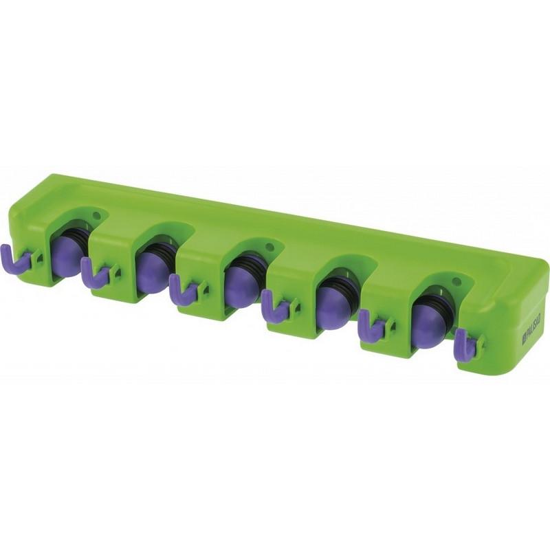 Держатель для уборочного инвентаря настенный Palisad пластик зеленый/фиолетовый (длина 445 мм).<br>Навесное хранение способствует удобству уборки подсобного помещения, а также исключает потерю или повреждение инвентаря.<br>Конструкция приспособления позволяет размещать предметы любого типа: грабли, мотыги, мелкий садовый инструмент, хозяйственные мелочи.<br>Размеры: 445×70×94 мм<br>Обрезиненная поверхность роликов и упоров предохраняет инструмент от выпадения из ячейки.<br>Дополнительные откидывающиеся крючки позволят подвесить веревку, канат или другую бытовую мелочь.<br>Монтаж к стене осуществляется при помощи дюбелей и саморезов.