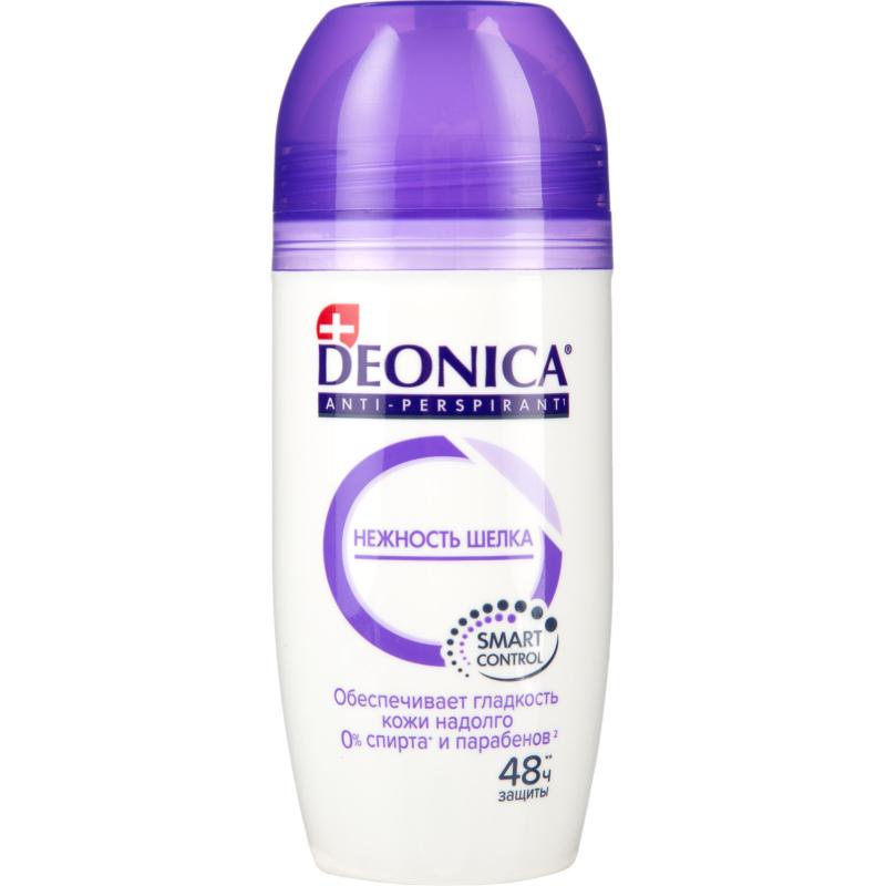 Дезодорант-антиперспирант женский Deonica Нежность шёлка шариковый 50 мл<br><br>Уникальный антиперспирант Deonica «Нежность шёлка» благодаря входящему в состав натуральному экстракту замедляет рост нежелательных волос и обеспечивает надёжную защиту и свежесть на 48 часов.<br><br>После применения антиперспиранта на протяжении месяца новые волоски начинают расти медленнее, становятся тоньше, а при условии регулярной эпиляции приобретают округлые края.<br>Содержит термически активированный хлоргидрат алюминия, который не забивает поры и эффективно справляется с потом и запахом без вреда для здоровья.<br><br>Придаёт коже невероятную мягкость благодаря ингредиенту бисаболол (получают из аптечной ромашки), который смягчает кожу и помогает справиться с раздражениями.<br><br>Deonica — антиперспирант, который гарантированно подарит Вам защиту и ощущение свежести в течение дня. Одобренная дерматологами формула подходит для людей с чувствительной кожей. Натуральные активные компоненты в составе антиперспиранта гарантировано защитят от неприятного запаха, а особая формула не оставит белых следов на одежде.<br><br>Высокая эффективность Deonica подтверждена клиническими испытаниями и потребительскими тестами в европейских лабораториях. Сбалансированная линейка средств рассчитана на физиологические особенности активности женщин и мужчин, на активность в течение дня и особенности кожи. С инновационным антиперспирантом нового поколения Deonica Вы сможете чувствовать себя уверенно при любых обстоятельствах.<br><br>Состав: Aqua, Aluminum Chlorohydrate, Steareth-2, Steareth-21, PPG-15 Stearyl Ether, Pentylene Glycol, Gymnema Sylvestre Leaf Extract, Bisabolol, Talc, Parfum, Tetrasodium EDTA.