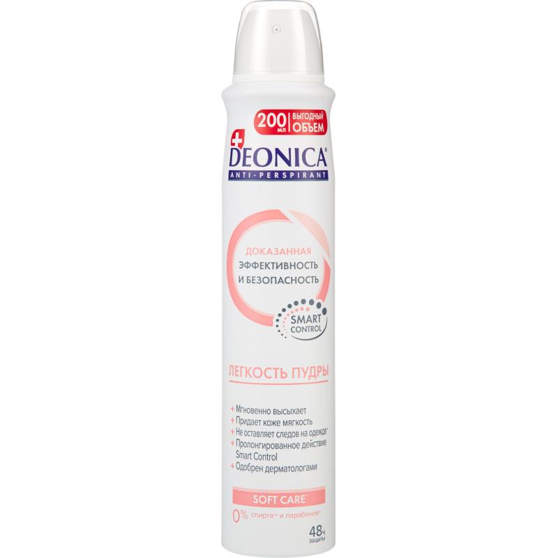 Дезодорант-антиперспирант женский Deonica Лёгкость пудры спрей 200 мл<br><br>Благодаря специальной формуле мгновенно высыхает, не оставляя ощущения липкости, придаёт коже невероятную мягкость и обеспечивает надёжную защиту от пота и запаха на 48 часов. Не оставляет следов на любой одежде. Одобрен дерматологами. 0% спирта и парабенов. Имеет лёгкий нежный аромат. Содержит термически активированный хлоргидрат алюминия, который не забивает поры и эффективно справляется с потом и запахом без вреда для здоровья. Придаёт коже невероятную мягкость благодаря ингредиенту бисаболол (получают из аптечной ромашки), который смягчает кожу и помогает справиться с раздражениями.<br><br>Объём: 200 мл.<br><br>Способ применения: перед применением встряхнуть. Распылять на кожу с расстояния 15-20 см. Использовать только по назначению.<br><br>Состав: Isobutane, Cyclopentasiloxane, Aluminum Chlorohydrate, Butane, Propane, Triethyl Citrate, C12-15 Alkyl Benzoate, PPG-14 Butyl Ether, Parfum, Disteardimonium Hectorite, Cetearyl Dimethicone/Vinyl Dimethicone Crosspolymer, Bisabolol, Propylene Carbonate.