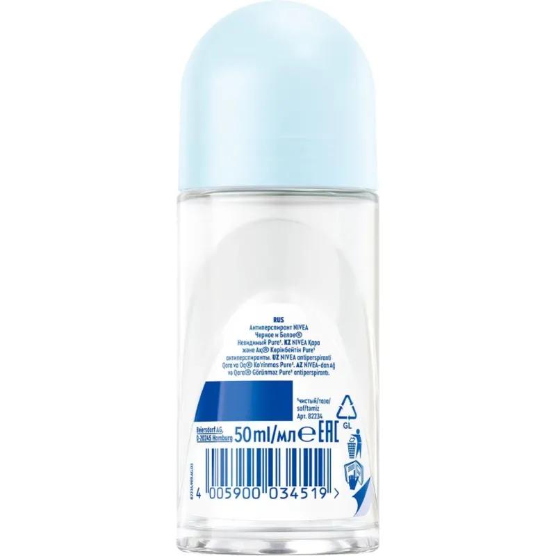 Дезодорант-антиперспирант женский Nivea Чёрное и белое шариковый 50 мл<br><br>Шариковый дезодорант-антиперспирант Nivea Чёрное и Белое Невидимый Pure с белоцветочным ароматом не оставляет белых следов на чёрной одежде и предотвращает появление жёлтых пятен на белой одежде. Чёрная одежда остаётся чёрной, а белая одежда дольше остаётся белой. Уникальная в ассортименте бренда формула имеет 5 факторов защиты: от запаха, пота, пятен, следов и раздражения. Роликовый антиперспирант женский защищает от неприятного запаха в течение 72 часов. Действует даже в стрессовых ситуациях или на занятиях спортом. Экономичный расход: шариковый антиперспирант даёт в 2 раза больше применений, чем спрей. Без этилового спирта.<br><br>Способ применения: наносить ежедневно на чистую сухую кожу подмышек. Дать полностью высохнуть во избежание образования пятен на одежде. Не наносить на повреждённую или раздражённую кожу.<br>— Не оставляет белых следов на чёрной одежде.<br>— Предотвращает появление жёлтых пятен на белой одежде.<br>— Защита от неприятного запаха на 72 часов.<br>— Для всех типов кожи.<br>— Дерматологически протестировано.<br><br>Состав: Aqua, Aluminum Chlorohydrate, Isoceteth-20, Dicaprylyl Ether, Butylene Glycol, Glyceryl Isostearate, Palmitamidopropyltrimonium Chloride, Laureth-7 Citrate, PEG-150 Distearate, Propylene Glycol, Tocopherol, Tetramethyl Acetyloctahydronaphthalenes, Citric Acid, Benzyl Alcohol, Amyl Salicylate, Isoeugenyl Acetate, Hexadecanolactone, Hydrogenated Palm Glycerides Citrate, Parfum.