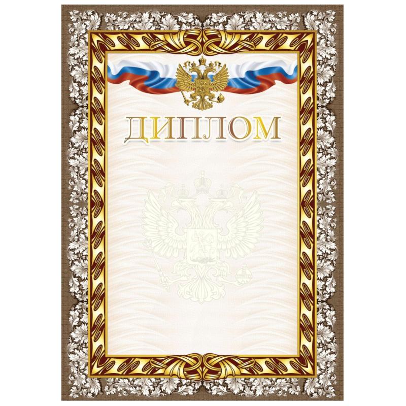 Диплом А4 250 г/кв. м с тиснением фольгой (10 штук в упаковке, КЖ-1624). Бланк выполнен в классическом стиле, имеет разноцветную ажурную рамку и светлый фон с узором. Сверху расположен герб и триколор, придающий диплому торжественный вид и официальность. Надпись Диплом выполнена при помощи тиснения золотой фольгой. Бланк предназначен для награждения за заслуги в учебе, спорте, трудовой деятельности, а также для выражения признательности и благодарности сотрудникам, коллегам и партнерам. Он отпечатан на полиграфическом мелованном картоне плотностью 250 г/кв. м. Формат А4 позволяет напечатать на нем текст с помощью стандартного принтера. В упаковке 10 шт.