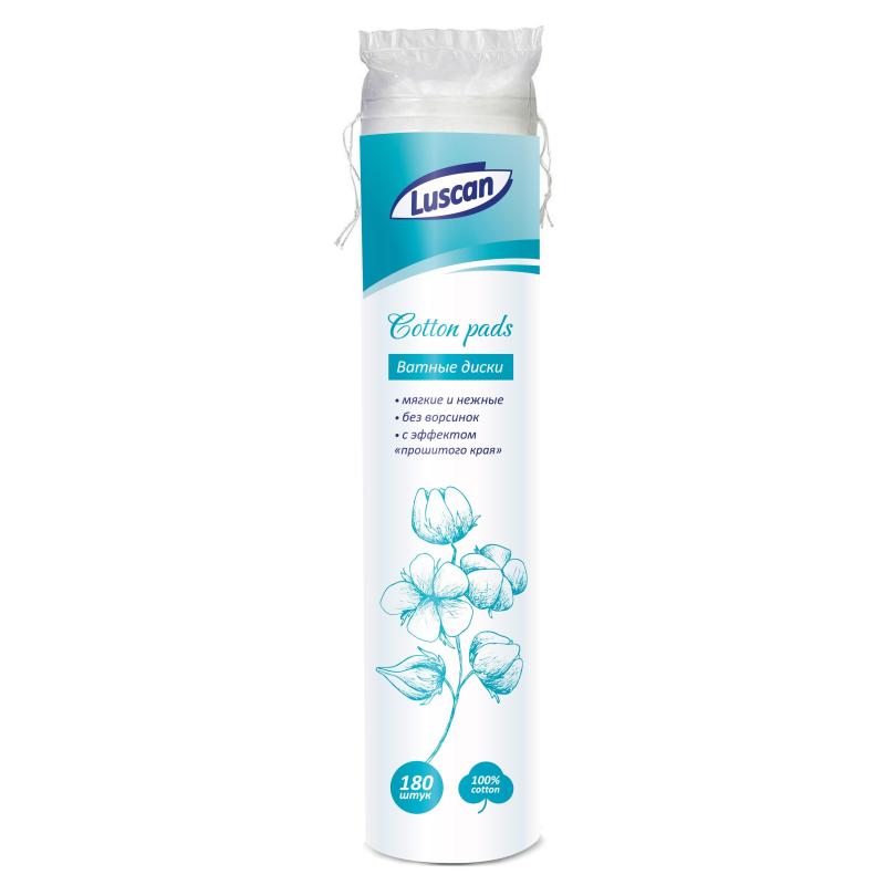 Диски ватные Luscan 180 штук в упаковке. Мягкие и нежные ватные диски Luscan предназначены для косметических и гигиенических целей. Благодаря эффекту «прошитого» края ватные диски не расслаиваются при использовании. У ватных дисков две поверхности — поверхность с тиснением «соты» обеспечивает более глубокое очищение, гладкая поверхность без тиснения обеспечивает деликатное нанесение косметических средств на кожу. Удобная перфорация на упаковке позволяет легко доставать ватные диски перед использованием. <br> Состав: 100% хлопок. <br> Номинальное количество: 180 штук.