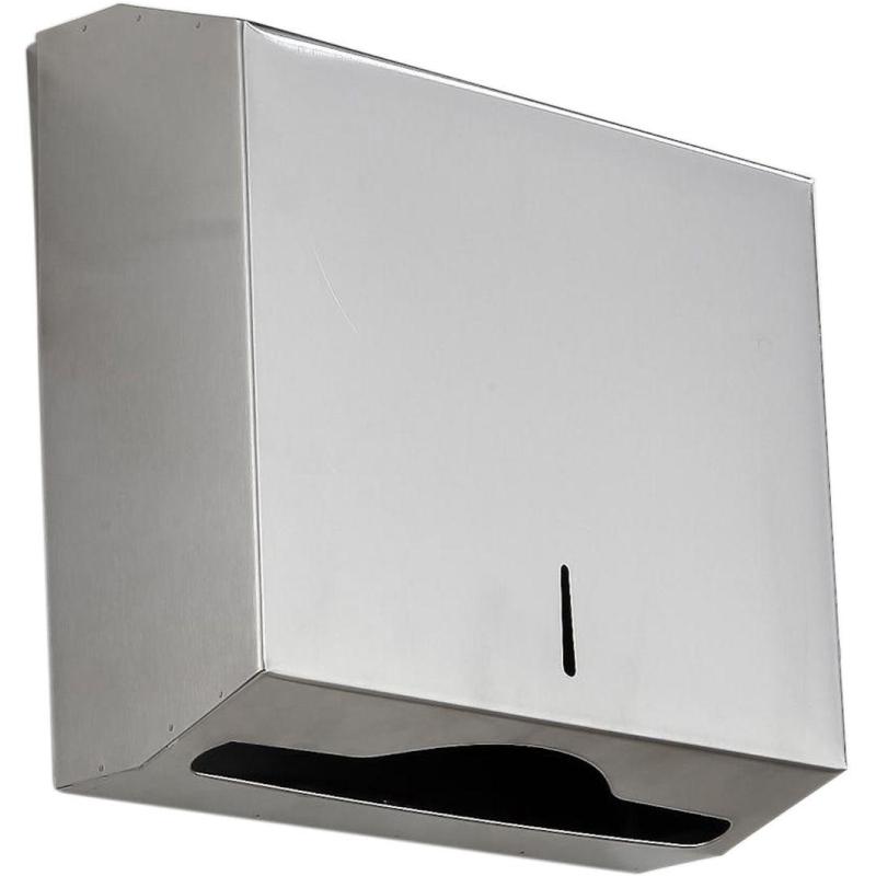 <b>Диспенсер для листовых полотенец Topfort металл серебристый.</b> <br>Дозатор бумаги из нержавеющей стали толщина: 0,6 мм. <b><br>Размеры диспенсера (ВхШхГ):</b> 255×280×100 мм. <b><br>Материал:</b> металл. <b><br>Комплект поставки:</b> диспенсер, ключ, саморезы для крепежа диспенсера.