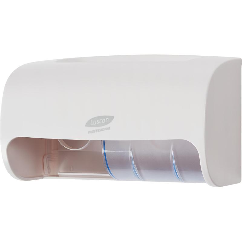 <b>Диспенсер для туалетной бумаги в рулонах Luscan Professional Etalon Doublemini пластиковый белый.</b><BR>Диспенсер для туалетной бумаги в рулонах Luscan Professional Etalon Doublemini отлично подходит для использования как для дома, так и для мест с низкой и средней проходимостью таких, как туалетные комнаты в ресторанах, офисах, фитнес центрах <nobr>и т. д.</nobr><BR>Диспенсер предназначен для подачи туалетной бумаги бытовых рулончиков с диаметром до 115 мм.<BR>Корпус диспенсера изготовлен из прочного <nobr>ABS-пластика</nobr>. Компактный диспенсер вмещает два стандартных рулончика и обеспечивает высокий уровень гигиены и комфорта за счет того, что расходный материал находится внутри корпуса и посетитель дотрагивается только до той туалетной бумаги, которой будет пользоваться.<BR><b>Размер диспенсера:</b> 264×160×160 мм.<BR><b>Материал:</b> <nobr>ABS-пластик</nobr>, полистирол<BR><b>Комплект поставки:</b> В комплект входят крепежные материалы для установки, инструкция и ключ. Легкость и простота в эксплуатации гарантируют долгосрочное и надежное функционирование диспенсера.<BR>Цвет: белый.<BR>Диспенсерная система: T4.<BR>Вид расходных материалов: рулонный с втулкой.<BR>Вид крепления: настенное.<BR><nobr>Страна-изготовитель</nobr>: Китай.<BR>Гарантийный срок работы: 1 год.<br><br>Оттенок изделия может отличаться в зависимости от освещения и цветопередачи вашего устройства.