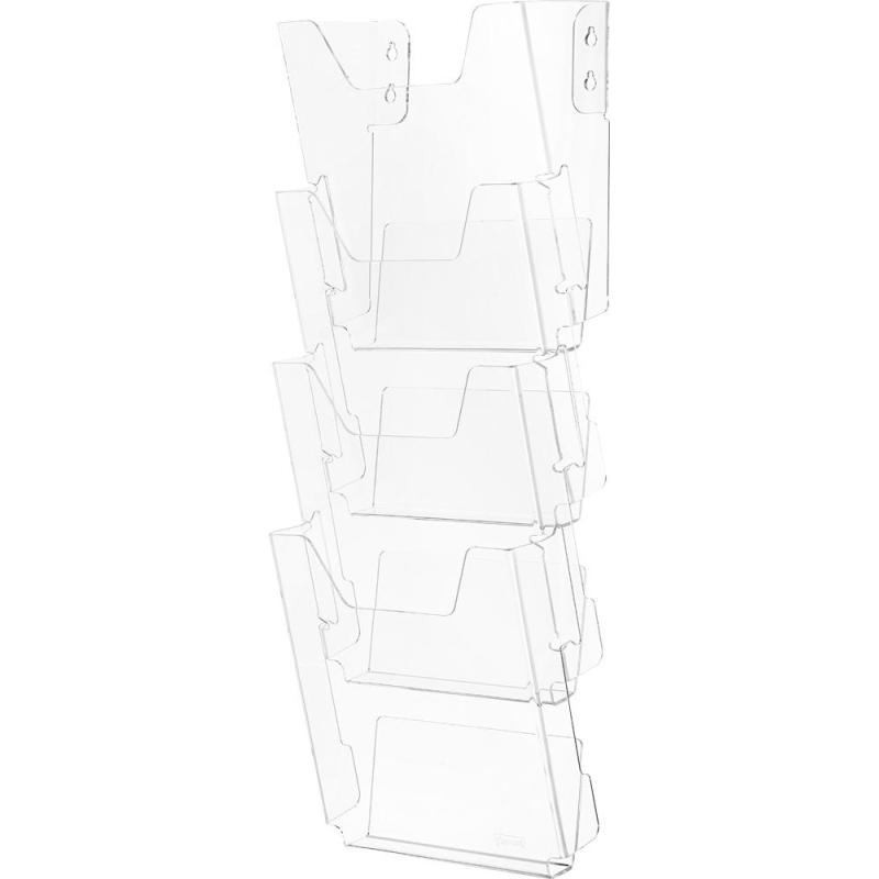 Вертикальный настенный дисплей «Комус» выполнен из акрилового прозрачного стекла и предназначен для хранения брошюр формата А4. Изделие состоит из 4 карманов, вместимость каждого из которых равна 32 мм. Поставляется в разобранном виде. Толщина акрила 2 мм. Габаритные размеры 1 кармана: высота — 240 мм, ширина — 220 мм, глубина: верхний карман — 105 мм, другие — 55 мм.