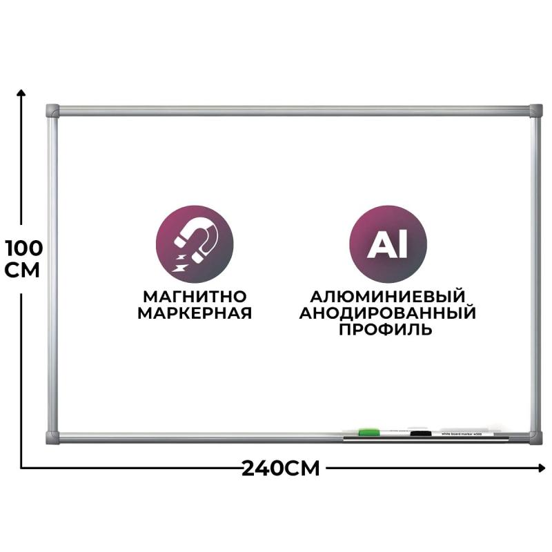 Доска магнитно-маркерная Комус Premium 100×240 см односекционная (полочка для маркеров)<br><br>Магнитно-маркерная доска с лаковым покрытием и алюминиевым анодированным профилем предназначена для настенного монтажа. Доска используется для записи маркерами для белых досок и прикрепления информации с помощью магнитов. Основа доски выполнена из ППС толщиной 10 мм.<br><br>Доска комплектуется полочкой для маркеров и набором крепежей для монтажа на стену. Крепление осуществляется закрытым типом в четырёх точках по углам доски. Размер рабочей поверхности доски составляет 98.2×238 см. Премиум профиль овального сечения шириной 21 мм придаёт доске увеличенную прочность и надёжность.<br><br>Для удаления плёнки потяните за верхний свободный угол, плёнка легко отойдёт от рабочей поверхности. При необходимости проведите вдоль рамы канцелярским ножом.
