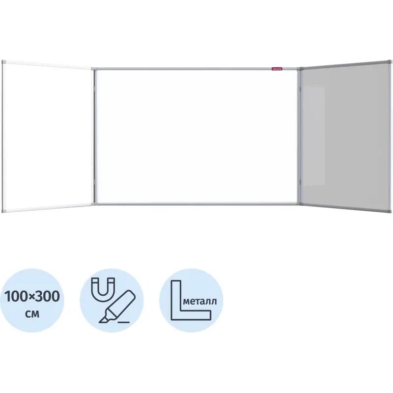 Доска магнитно-маркерная Attache 100×300 см трёхсекционная с эмалевым покрытием (полочка для маркеров)<br> <br> Магнитно-маркерная доска представляет собой двустороннюю конструкцию, подходящую для офисов и учебных заведений. Она состоит из центральной секции шириной 150 см и двух боковых секций шириной по 75 см каждая. Высота доски — 100 см. Боковые секции можно откинуть вовнутрь, что добавляет удобства при эксплуатации.<br><br> Рабочая поверхность доски белая, что позволяет использовать её с маркерами для магнитно-маркерных досок и прикреплять информацию с помощью магнитов. Для удаления записей рекомендуется использовать специальные губки-стиратели и чистящий спрей для более тщательной очистки. В комплект входит лоток для маркеров, а крепёж для установки на стену уже включён в набор.<br> <br> Конструкция доски усилена премиум профилем овального сечения шириной 21 мм, что придаёт ей дополнительную прочность и надёжность.<br> <br> Для удаления плёнки потяните за верхний свободный угол, плёнка легко отойдёт от рабочей поверхности. При необходимости проведите вдоль рамы канцелярским ножом.