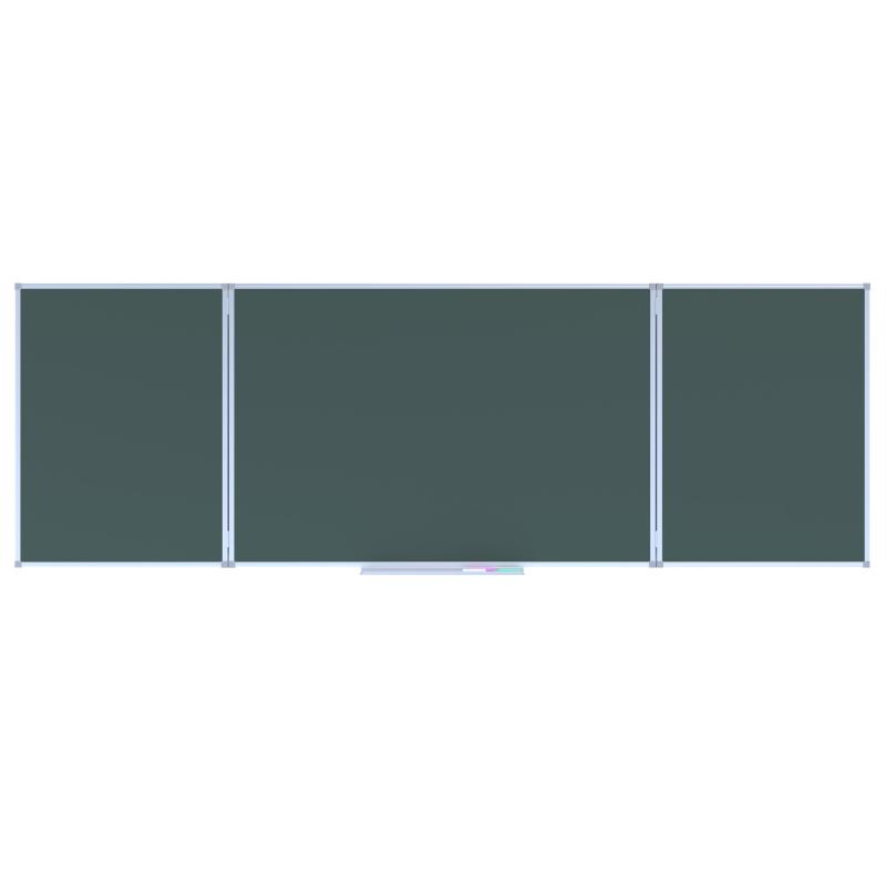 Трехэлементная настенная доска для письма мелом находит широкое применение в учебных заведениях. Металлическая поверхность позволяет размещать информацию при помощи магнитов. Внешние поверхности боковых элементов расчерчены в клетку и в линию. Размер доски: 100×300 см.<BR>Особенности:<BR>— правая, обратная сторона секции в клетку, размер клетки: 5×5.<BR>— левая, обратная сторона секции в линейку, расстояние между линиями 5 см