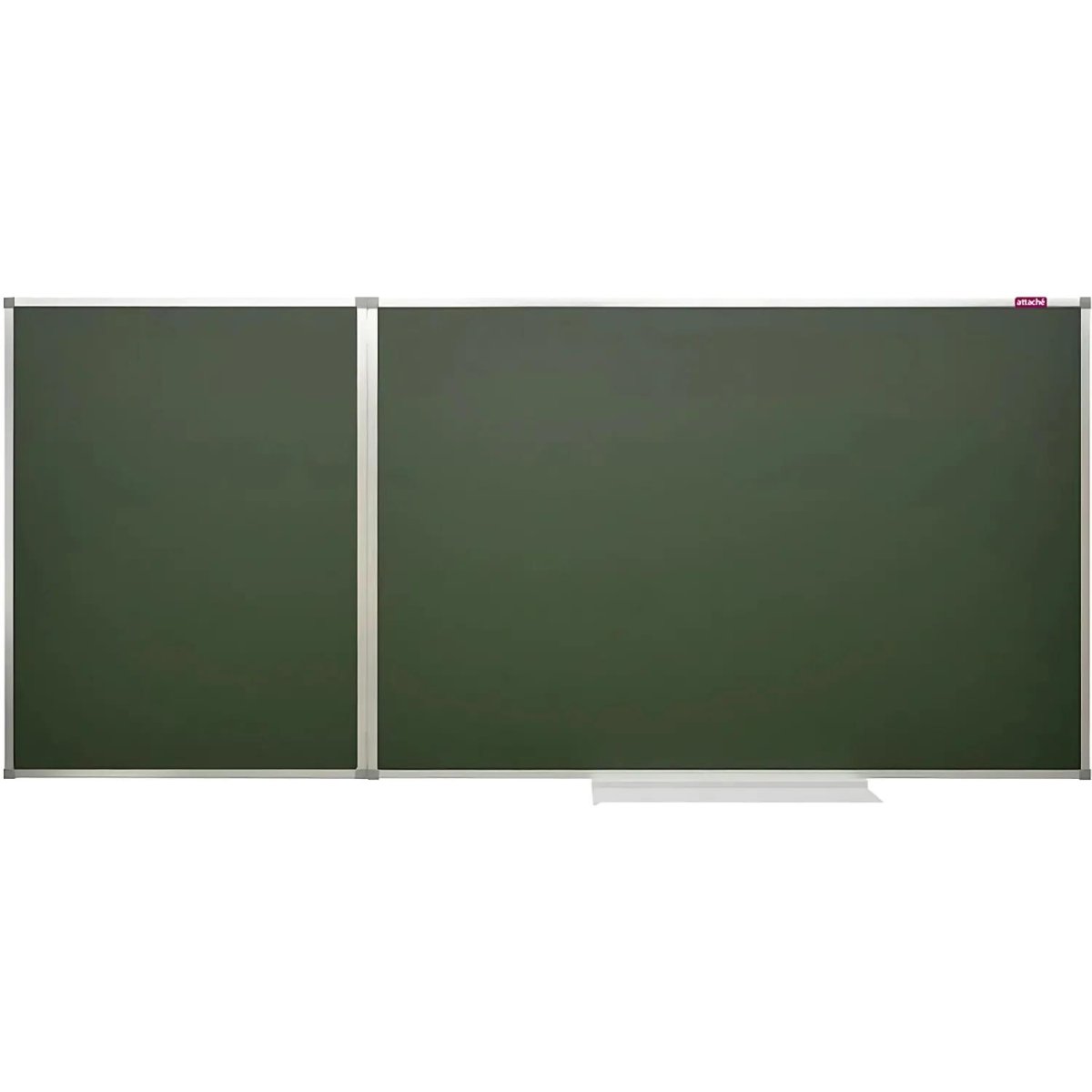 Доска двухсекционная магнитно-меловая Attache. Доска имеет 1 створку и 3 рабочие поверхности. Размер доски в закрытом состоянии 100×150 см, размер боковой секции 100×75 см, размер доски в открытом состоянии — 100×225 см. Рама из алюминиевого анодированного профиля, скрепленного пластиковыми уголками. Предназначена для нанесения информации цветным мелом. Поверхность доски также позволяет прикреплять листы бумаги, карты и тому подобное с помощью магнитов. При удалении записей используются только специальные губки-стиратели, в комбинации со специализированным спреем. В комплекте широкая полочка для мела. Скрытое крепление к стене в четырех точках (центральная секция).<br>Для удаления пленки потяните за верхний свободный угол, пленка легко отойдет от рабочей поверхности. При необходимости проведите вдоль рамы канцелярским ножом.