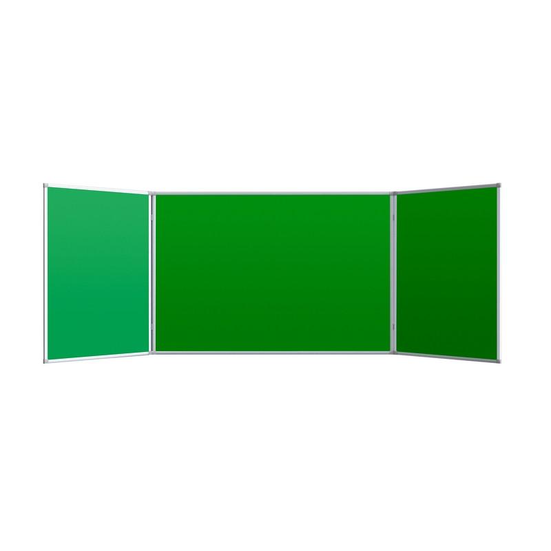 Доска трехсекционная магнитно-меловая Attache, лаковое покрытие. Доска имеет 2 створки — 5 рабочих поверхностей.<br>Обратная сторона створок доски — зеленая. Размер доски в закрытом состоянии 150×100 см, размер боковых секций 100×75 см, размер доски в открытом состоянии — 300×100 см. Рама из алюминиевого анодированного профиля, скрепленного пластиковыми уголками.<br>Предназначена для нанесения информации цветным мелом. Поверхность доски также позволяет прикреплять листы бумаги, карты и т. п. с помощью магнитов. При удалении записей используются только специальные губки-стиратели, в комбинации со специализированным спреем. В комплекте широкая полочка для мела. Скрытое крепление к стене в четырех точках (центральная секция). Комплектация: шуруп универсальный 5×100-4; дюбель распорный 8×80-4; полочка, инструкция. Толщина рабочей поверхности 18 мм, с рамкой 24 мм.<br>Страна производитель Россия.