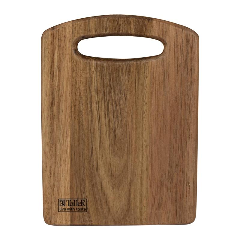Доска разделочная TalleR деревянная 28×20 см.<br>Размер доски: 28×20×1.5 см. <br>Доска выполнена из благородной древесины акации, одной из самых твердых пород дерева. Легко использовать и ухаживать. Не тупит ножи, не впитывает запахи. Обращаем внимание, что рисунок каждой доски индивидуален (может отличаться от фотографии в карточке товара), так как изделие выполнено из натурального материала. Древесина акации может быть как темных, так и светлых оттенков, и это никак не сказывается на эксплуатационных характеристиках разделочной доски. <br>Рекомендуется ручная мойка.