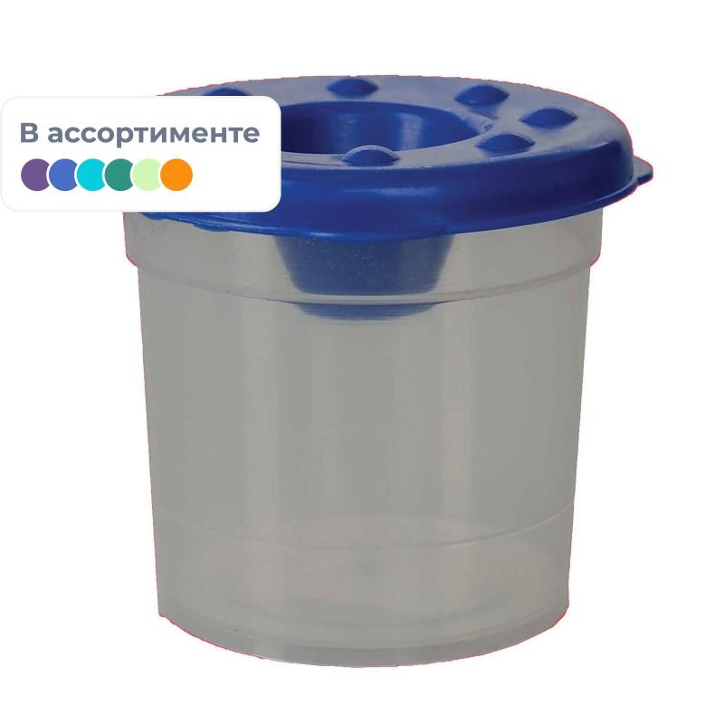Емкость для воды (стакан-непроливайка) 180 мл корпус прозрачный с отметкой безопасного уровня <br><br>Предназначен для рисования в качестве емкости для воды. <br>Нижняя часть изготовлена из полипропилена, крышка изготовлена из полиэтилена с красителем. <br>Плотно прилегающая к стенкам крышка препятствует выливанию воды на рабочую поверхность. Специальная линия указывает на максимально возможный уровень наполнения водой. Стильное сочетание матовой и глянцевой поверхности. <br>Объем — 180 мл. <br>Нижний диаметр — 57 мм.<br>Верхний диаметр — 72 мм. <br>Высота без крышки — 65 мм. <br>Высота с одетой крышкой — 70 мм. <br>Объем самого стаканчика до самого верхнего края 180 мл.<br>Объем до верхней полоски (рекомендуемый объем воды) — 130 мл.